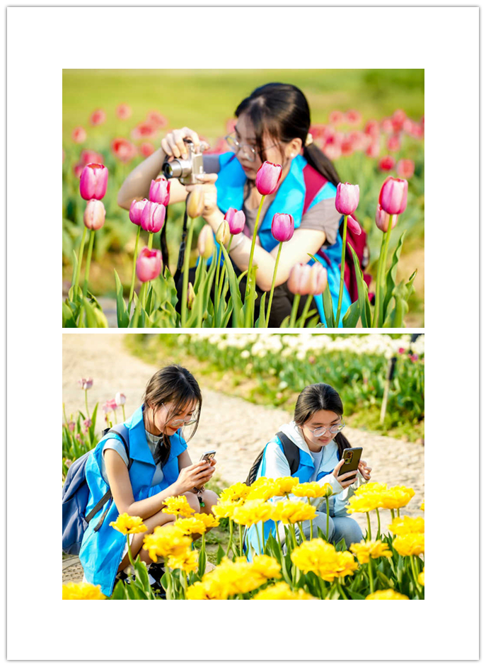 一天的旅程,學(xué)生們迎著春風(fēng)走進天然氧吧木蘭天池,在欣賞峽谷風(fēng)光的同時觀看山水沉浸式演藝《木蘭少年志》,并在小天池、大天池等地合影留念。隨后便來到木蘭花鄉(xiāng)景區(qū),此時園中的郁金香已進入盛花期,學(xué)生們或蹲下身子或在花道旁依次排開留下青春的倩影。當(dāng)夜幕四合,已換上漢服的學(xué)子們穿梭在木蘭不夜城古色古香的街區(qū),品小吃看表演。