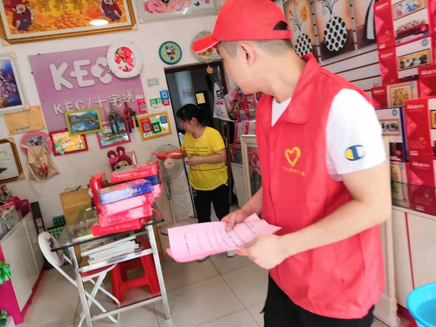 另一部分則走進社區(qū)沿街商鋪,向商鋪經營者宣傳“迎軍運 講文明 樹新風”的具體要求和《武漢軍運會東道主文明公約》倡議內容,希望通過他們向往來客戶進行傳達和宣傳。